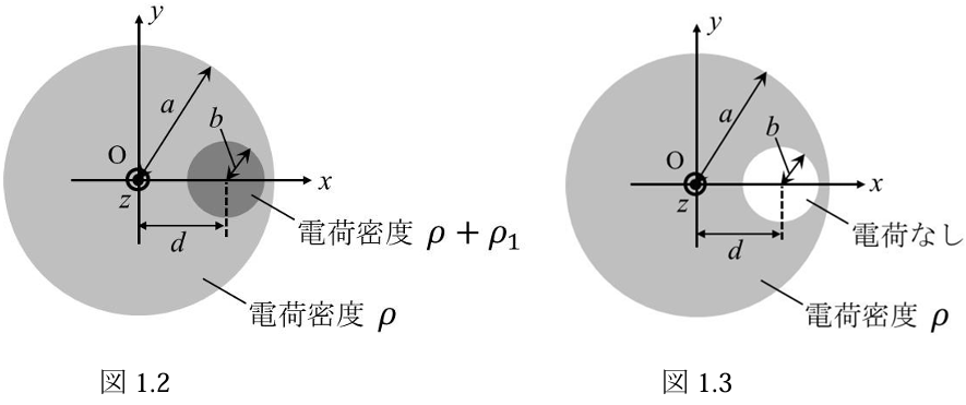のように,図 の球状に分布した電荷に,位置 を中心とする半径 の球状に分布した電荷を追加した。ただし, および であり,電荷を追加した領域の単位体積当たりの電荷密度は一定値 になった。 新しく電荷を追加した領域内部での