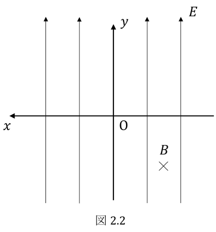 (2) 図 のような一様な磁束密度 の磁場および電場 の中での荷電粒子の運動を考える。磁場は紙面鉛直方向 (表面から裏面の方向) を向いており,電場は 方向を向いている。時刻 のときに,原点 に荷電粒子を静かにおいた。そのときの荷電粒子の初速度は である。