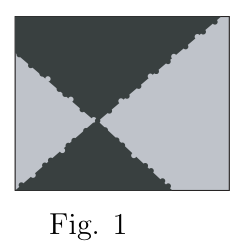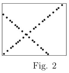 Consider a method to find equations of two straight boundary lines of the two-colored regions like Fig. 1. Suppose the points in Fig. 2 are derived through processing the image of Fig. 1 and answer the following questions.