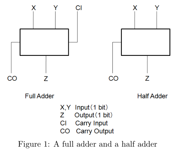 (1) Show the truth-table of the full adder and the half adder shown in Figure 1. Then construct them using AND, OR and NOT gates.