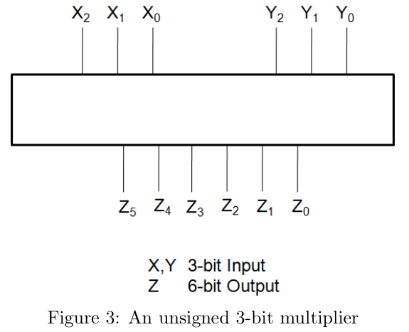 (3) Design a 3-bit by 3-bit multiplier that produces 6-bit output using adders from (1) and (2) with additional AND, OR and NOT gates. Inputs for the multiplier are two unsigned 3-bit integers and the output is an unsigned 6-bit integer as shown in Figure 3.