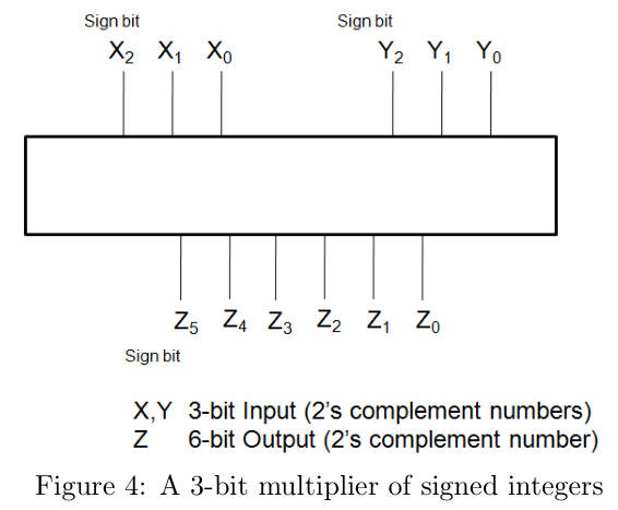 (4) Design a 3-bit by 3-bit multiplier that produces 6-bit output using adders from (1) and (2) with additional AND, OR and NOT gates. The inputs of the multiplier are two signed 3-bit integers and the output is a signed 6-bit integer as shown in Figure 4. Two's complement numbers are used both in inputs and the output numbers.