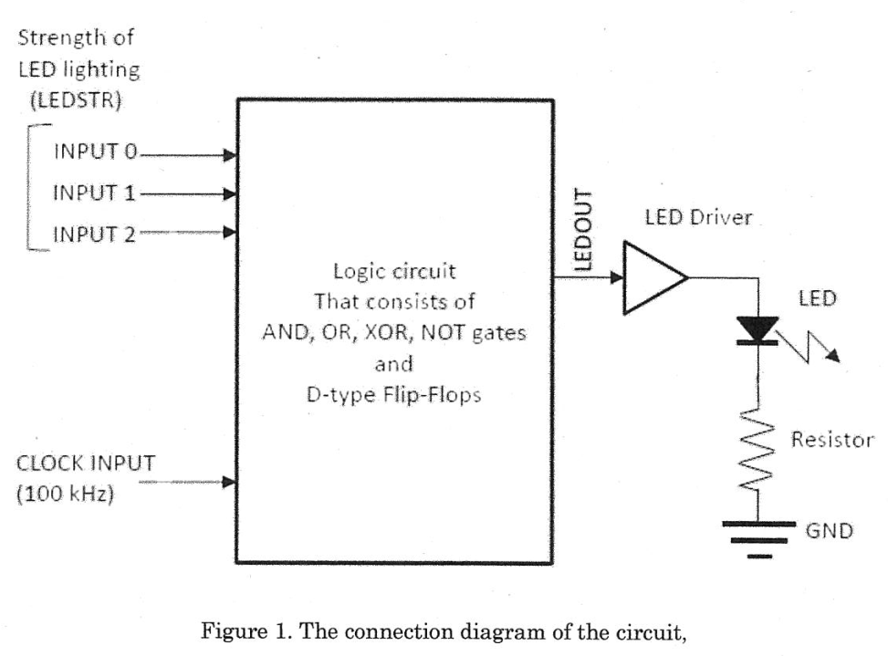 Condition 1: Inputs of the circuit to design are LEDSTR and CLOCK INPUT (LEDOUT. LEDOUT is directly connected to the LED driver and lights the LED. When LEDOUT is H, LED is on, and when LEDOUT is L, LED is off.