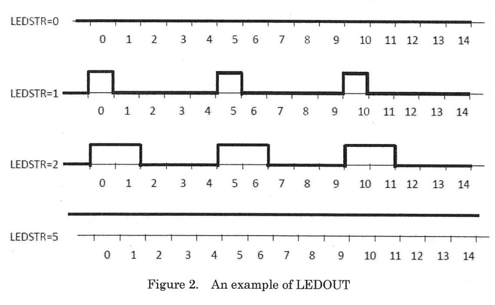 LEDSTRis 1, 2 clock periods whenLEDSTRis 2, ......., 5 clock periods (i.e. always on) whenLEDSTRis 5. Figure 2 is an example of the output waveform. -