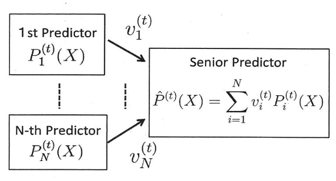 Let the probability distribution that the -th predictor outputs on the -th day be () where we let (). There is a senior predictor who aggregates the outputs of the predictors. On the -th day, the senior predictor takes a weighted average over the probability distributions output by the predictors to output a weather probability distribution (). Here the weight on the -th predictor on the -th day is denoted as ( ()). That is, on the -th day, is given by (see Figure 1).