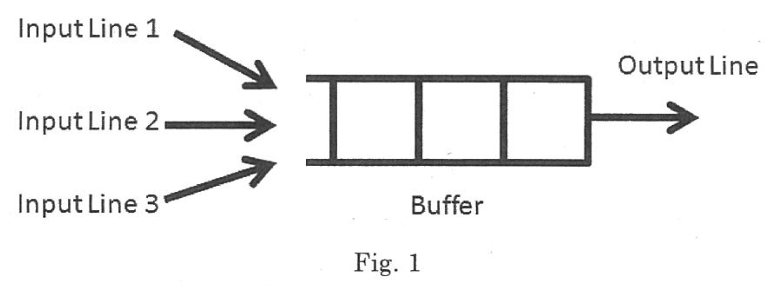 Consider the system (shown in Fig. 1) that transfers the packets arriving from the three input lines to the output line every discrete time