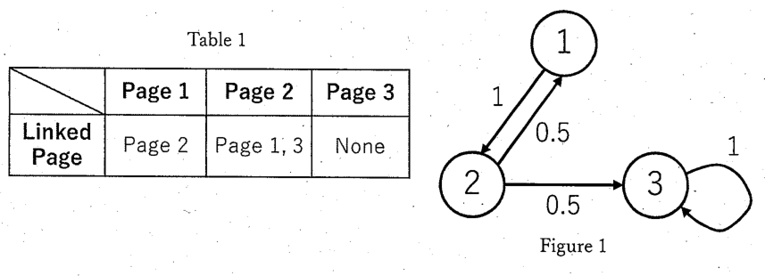 Suppose that there are web pages. A user staying at a web page at time () will move to one of the linked pages at time with equal probability. If there are no linked pages, the user will stay at the same page as time . Let () denote the probability of the user staying at the -th page at time , and denote the vector that summarizes them.